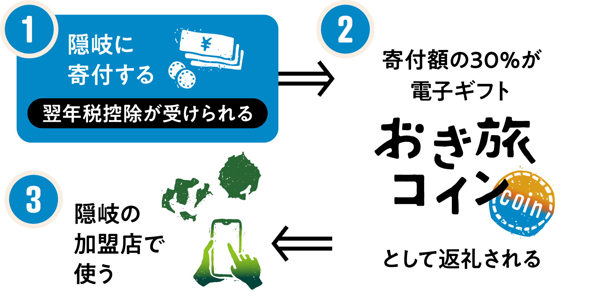 新しいふるさと納税の形です。現地を訪れることなく返礼品がもらえる従来の郵送型のふるさと納税とは異なり、隠岐諸島の魅力に直接触れ、隠岐諸島が好きになったり応援したいと思ったりしたタイミングでその場で寄附ができ、隠岐諸島内の加盟店にて一円単位で使える電子チケット[隠岐諸島e街ギフトおき旅コイン(以下、おき旅コイン)]をもらえることが大きな特徴です。